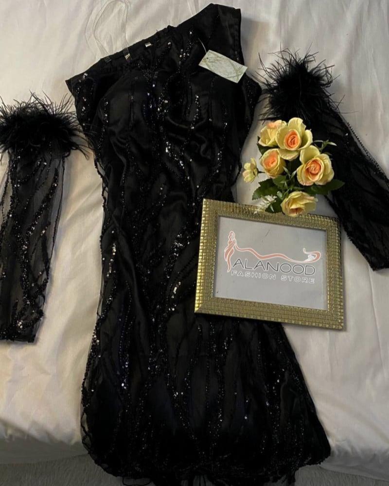 فستان اسود شك بأكمام ريش جدا فخم للمناسبات