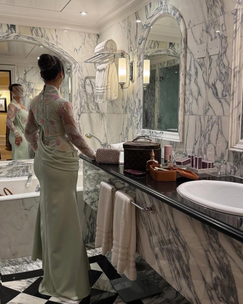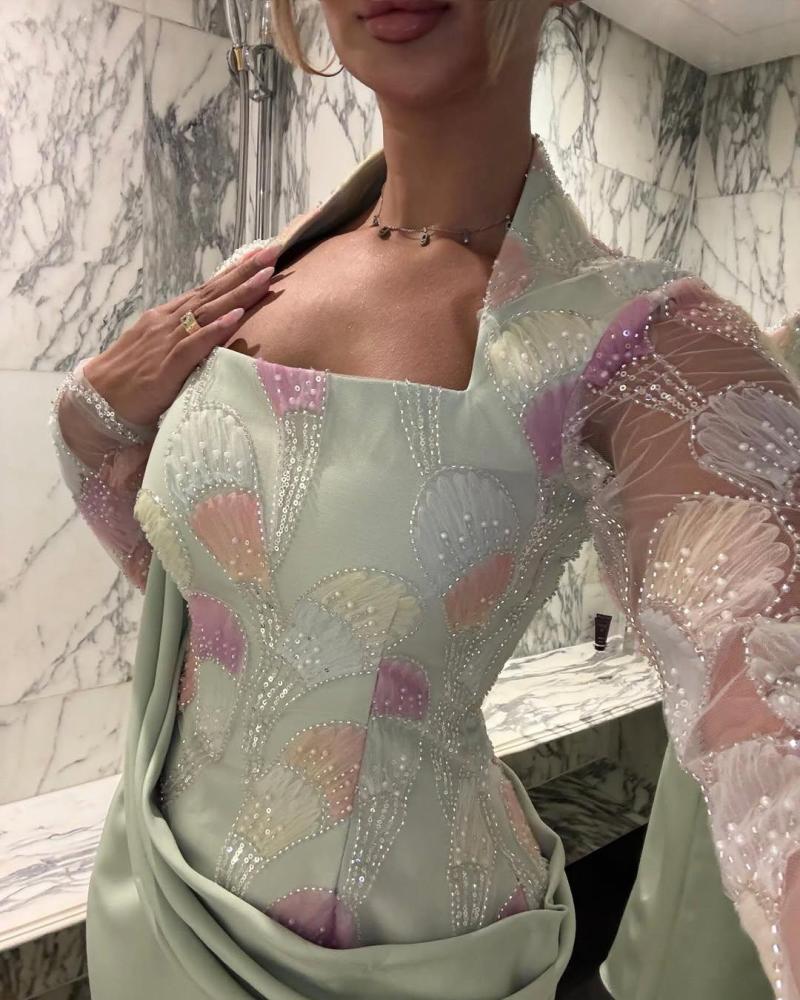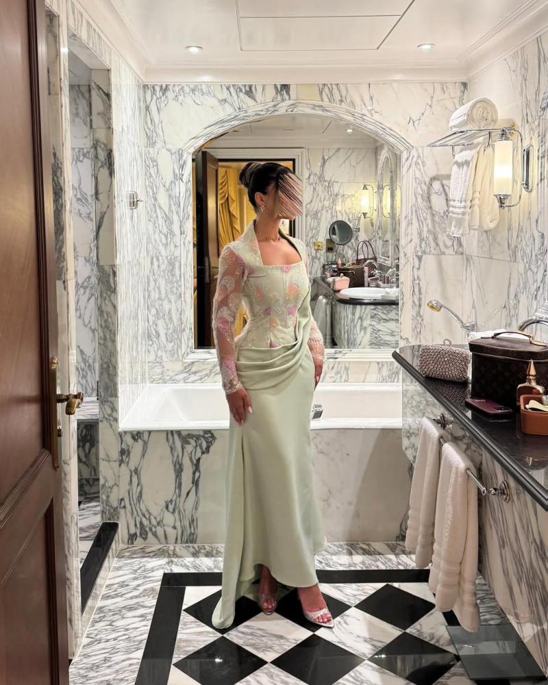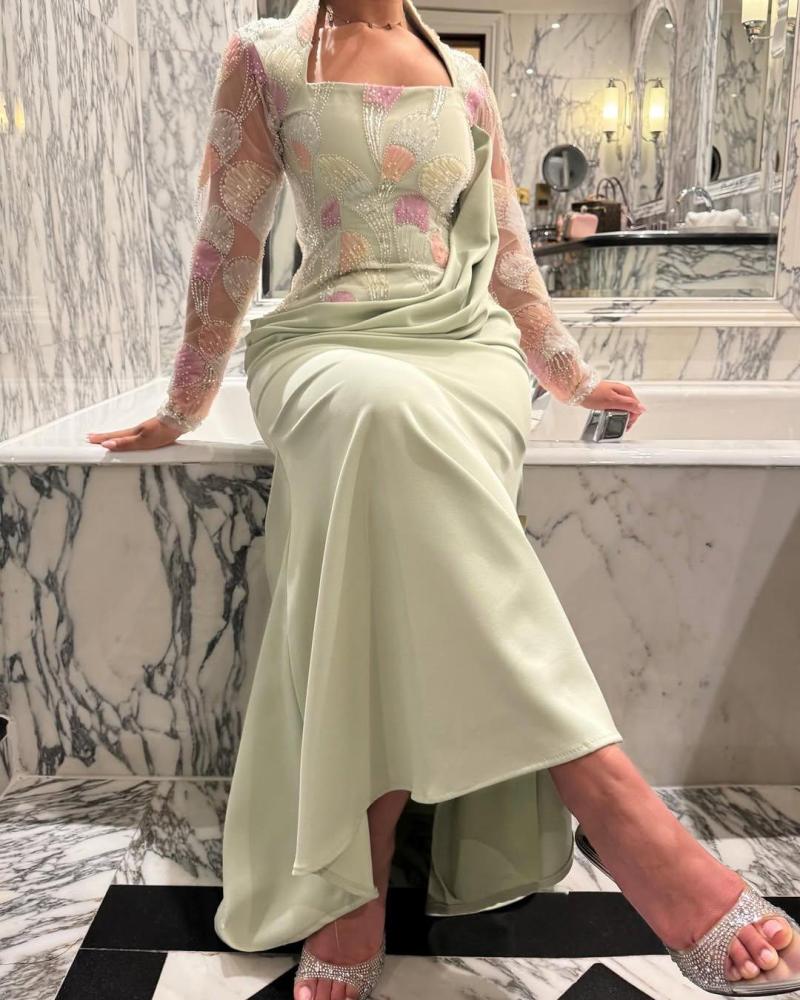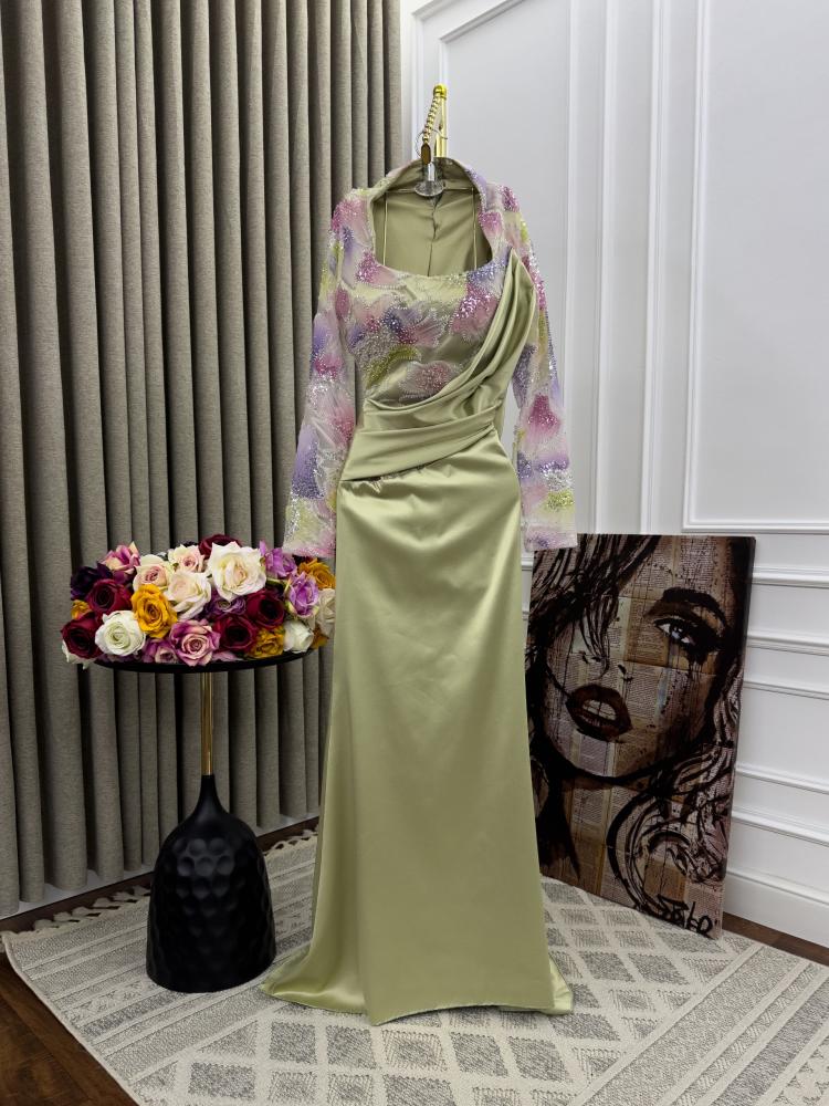 فستان راقٍ بتصميم شرقي عصري، باللون الأخضر الفاتح الهادئ يضفي لمسة من النعومة والأنوثة. الجزء العلوي يتميز بتطريز ناعم بألوان باستيلية متناسقة على قماش شفاف بأكمام طويلة، يبرز الذوق الرفيع والرقة في التفاصيل. الرقبة مربعة تضيف لمسة كلاسيكية فاخرة، بينما الجزء السفلي مصمم بانسيابية ناعمة مع ثنيات جانبية تزيده أناقة. القصة توازن بين الفخامة والبساطة، وتمنح من ترتديه طابعاً واثقاً وراقياً يليق بجمالك الطبيعي.