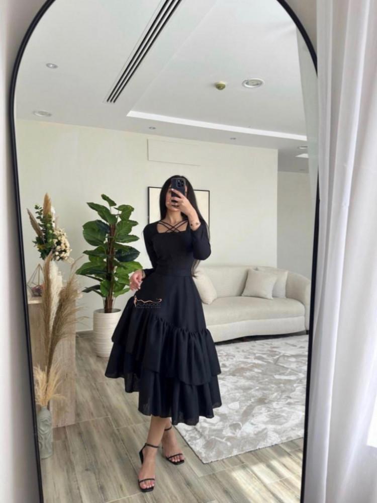 فستان الكتان اسود طبقات ميدي ناعم وانيق