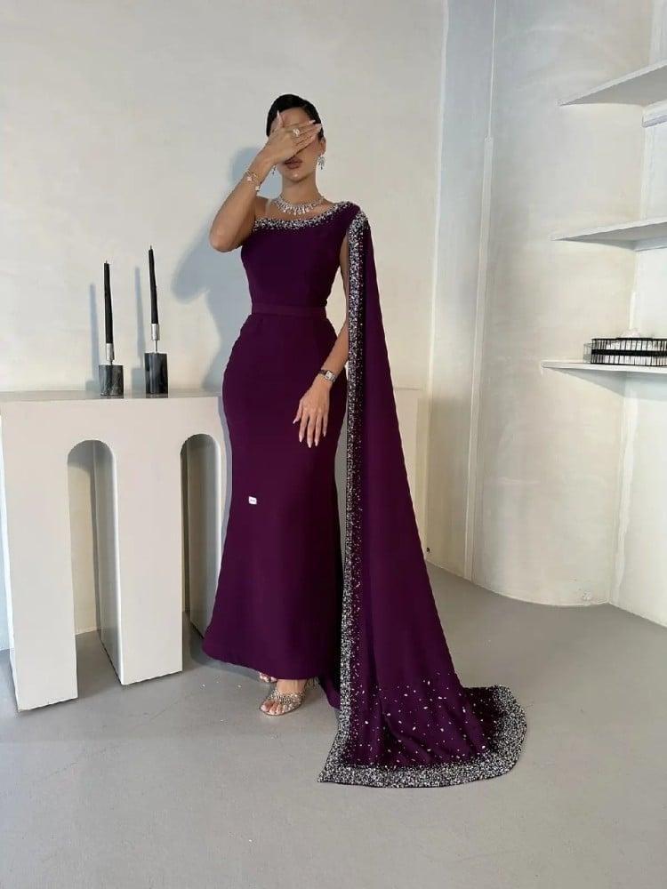 فستان أنيق بلون عنابي ساحر، بتصميم وان شولدر يبرز جمال الكتف ويضفي لمسة من الرقي والفخامة. يتميز بقصة ضيّقة تُبرز أنوثة القوام بانسيابية مثالية، مع شال طويل منسدل من الكتف مزين بحواف لامعة وكريستالات ناعمة تنثر الضوء بحركة راقية. خامته فاخرة وتفاصيله دقيقة تنطق بذوقك الرفيع. كأنك لوحة فنية تمشي بثقة وأناقة.
